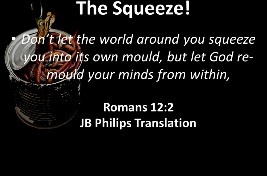 So, like the ocean, culture is all around us. Culture is the water we swim in. Like the ocean, culture has both invisible undercurrents and visible waves. In this series we want to equip dads to recognize both the undercurrents that are shaping our culture and the specific tidal waves—the destructive worldviews that are rocking our world. But remember, the WRONG solution is to abandon the very purpose for which God created humans--engaging and shaping culture. We are not to run away from this task that God assigned to Adam and Eve. Every other generation in history has had to wrestle to with living IN the world (to shape it) but not be OF the world (shaped by it). Human culture has always been shaped both by human fallenness and by human redemption. Separating ourselves from culture is irresponsibly being AWOL from our God-assigned post. For the moment, though, let’s leave the ocean analogy to look at HOW the world squeezes us and our loved ones into its mold. Remember the command is to resist BEING CONFORMED to the world. Here are additional metaphors for the way culture conforms us.